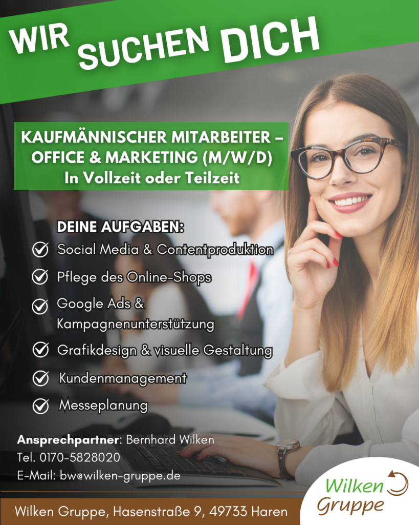 Zur Verstärkung unseres Teams suchen wir einen kaufmännischen Mitarbeiter (m/w/d) für Office & Marketing – in Vollzeit oder Teilzeit. Dich erwarten abwechslungsreiche Aufgaben rund um Social Media, Online-Shop, Marketing und Kundenmanagement. Wenn du strukturiert arbeitest, kreativ denkst und Lust auf ein wachsendes Unternehmen hast, freuen wir uns auf deine Bewerbung.